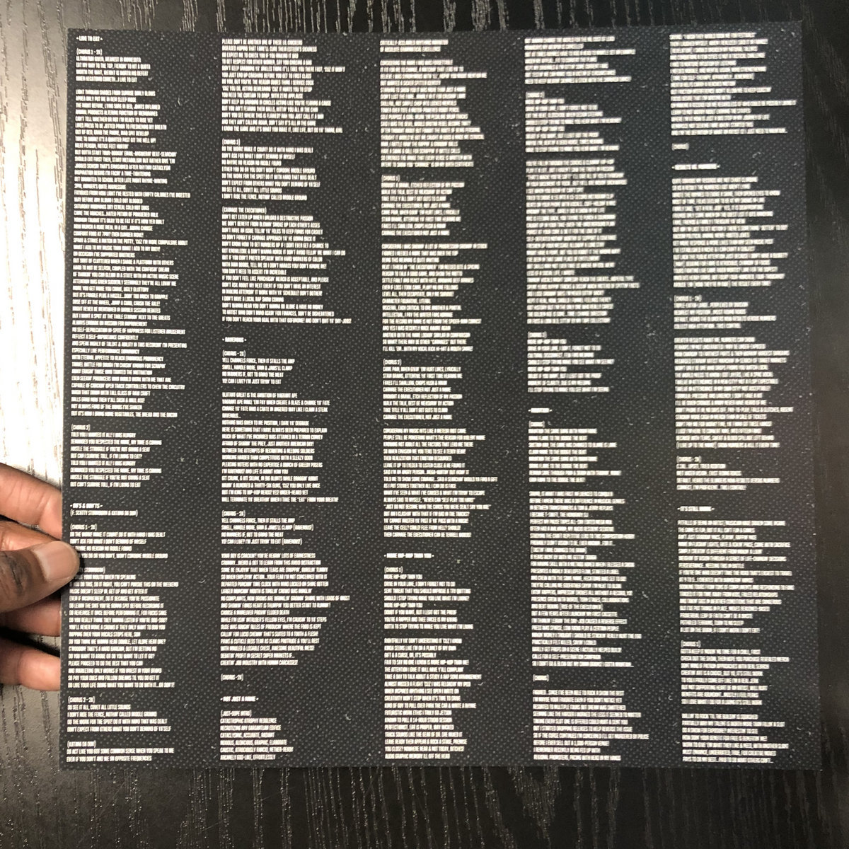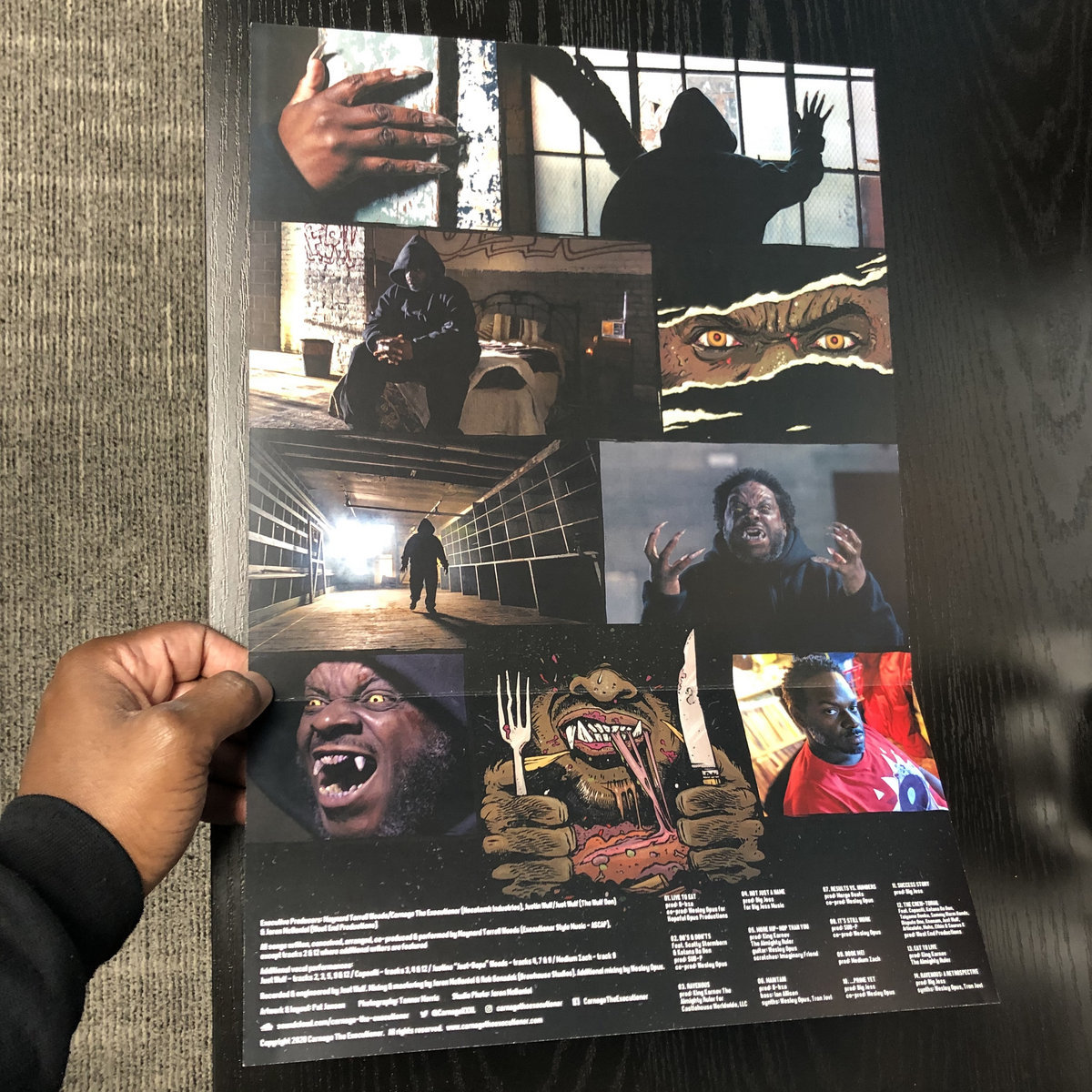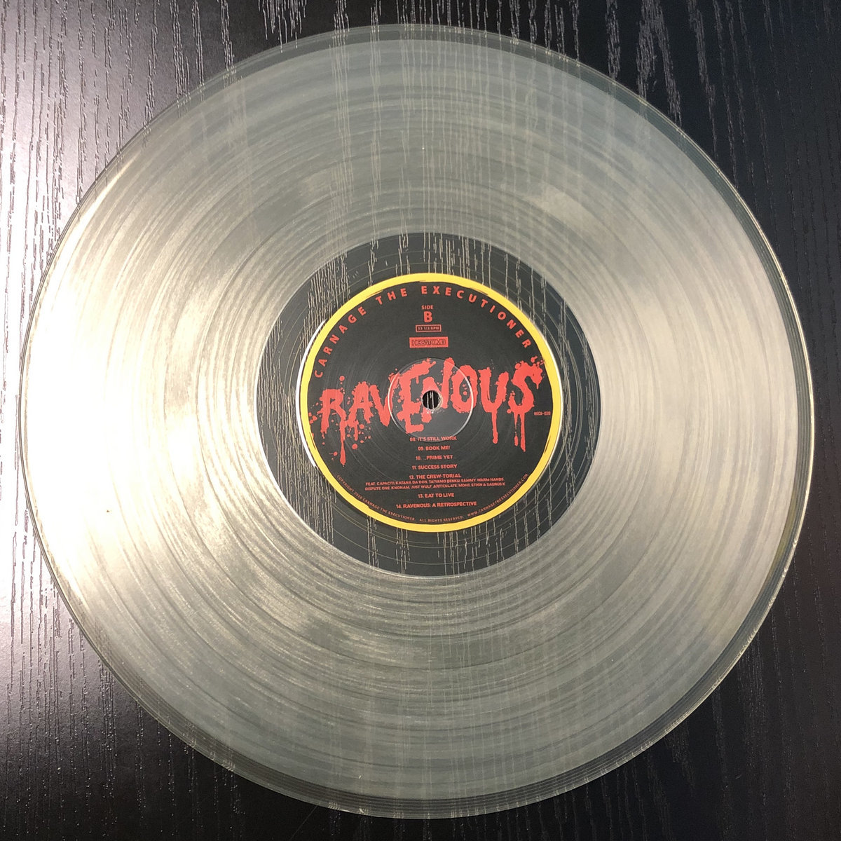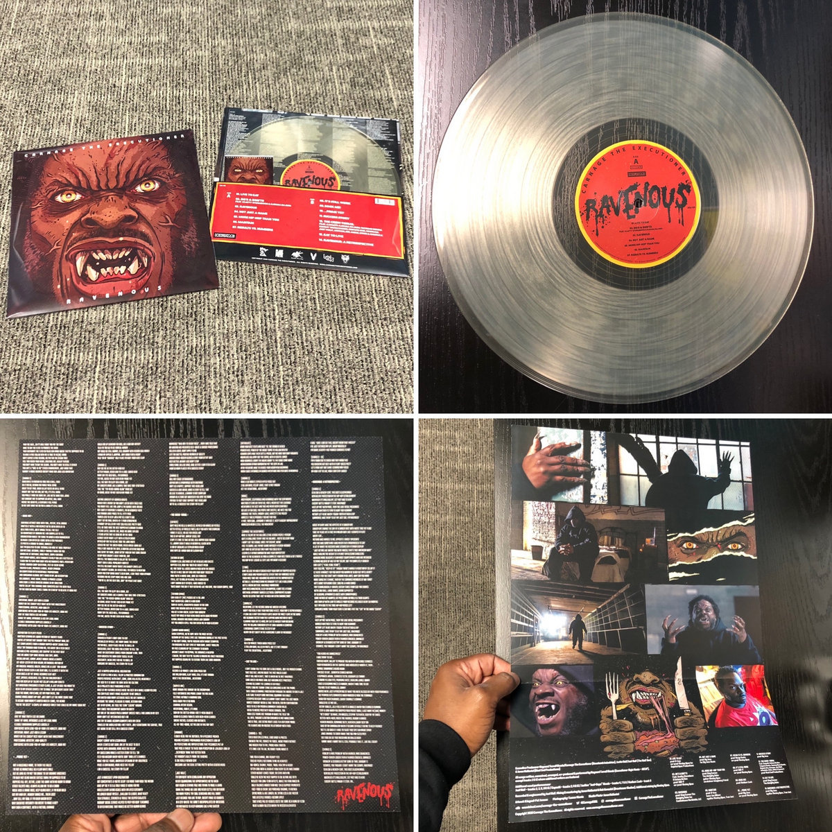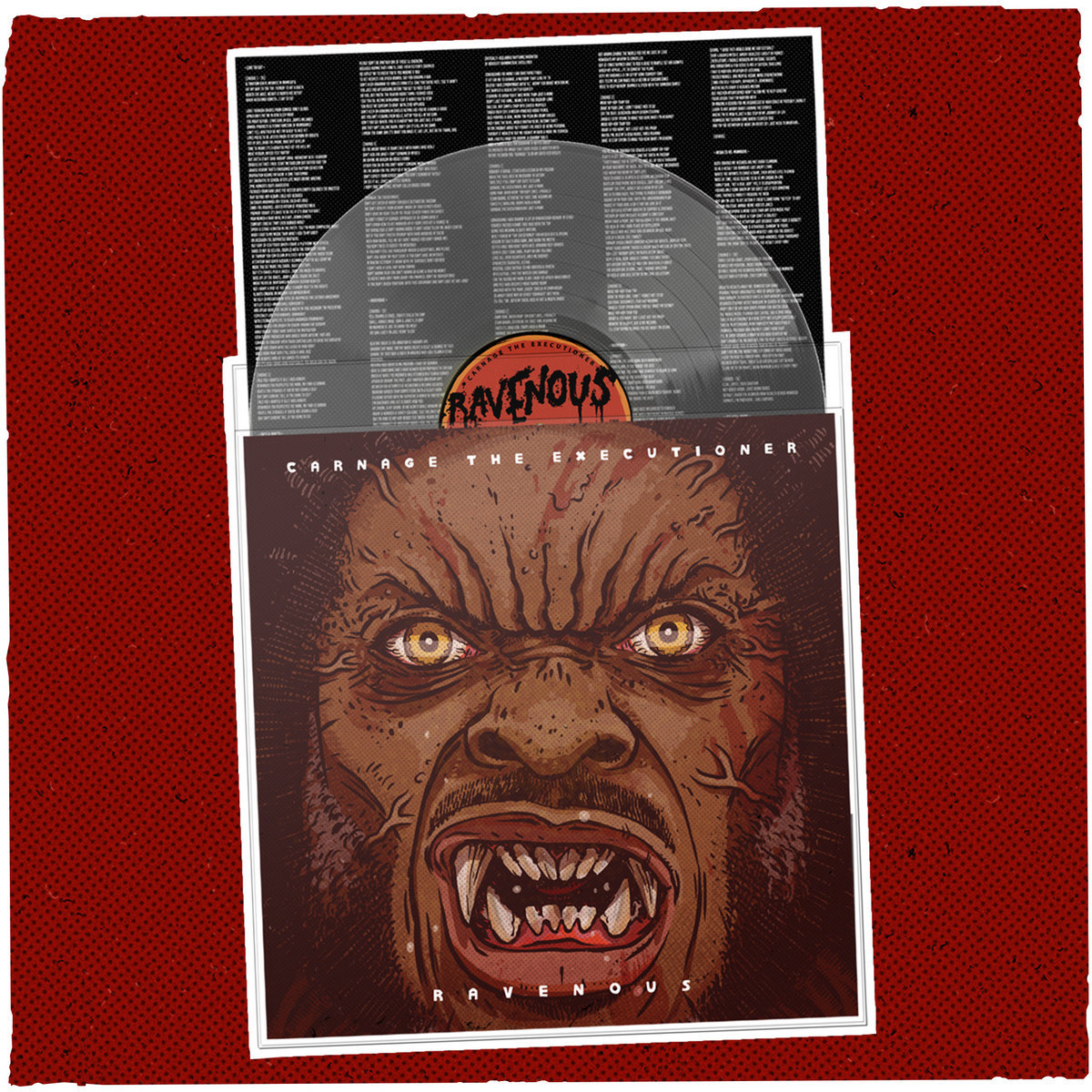 Designed with eco-friendly packaging (no shrink wrap or glue). This beauty is pressed on see-through vinyl with full-color, highly-detailed labels. The album sleeve folds out into a poster with a collage of real-life stills and brilliant drawings. The two-sided lyric sheet allows listeners to further examine Carnage The Executioner's intricate writing. Digital download card included.